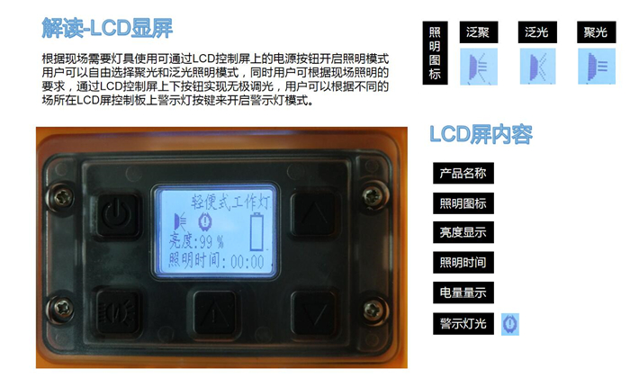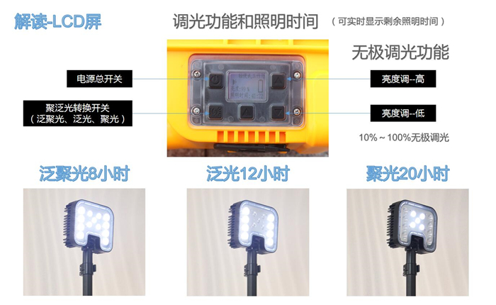 4、針對(duì)不同的照明模式,可手動(dòng)進(jìn)行10-100%的無極調(diào)光,同時(shí)可在LCD顯示屏上直觀的顯示剩余電量,預(yù)算可繼續(xù)工作時(shí)間。