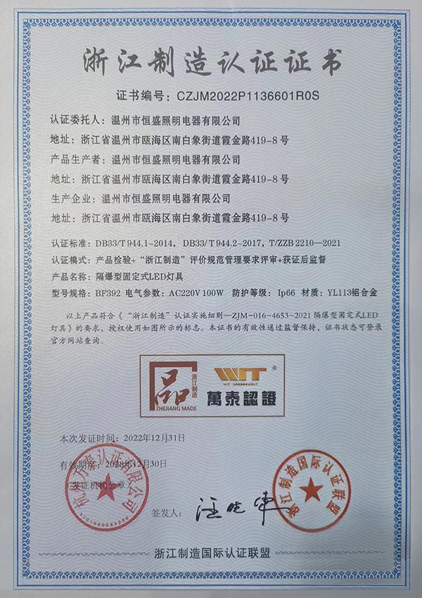2022年12月 ,溫州市恒盛照明電器有限公司順利通過(guò)了產(chǎn)品檢驗(yàn)與“浙江制造” 評(píng)價(jià)規(guī)范管理要求評(píng)審 ,獲得《浙江制造認(rèn)證證書(shū)》 !我司將會(huì)繼續(xù)不斷創(chuàng)新 ,開(kāi)拓進(jìn)取 ,努力將更優(yōu)質(zhì)的產(chǎn)品輸送給市場(chǎng) ,感謝新老客戶一直的信賴與支持。