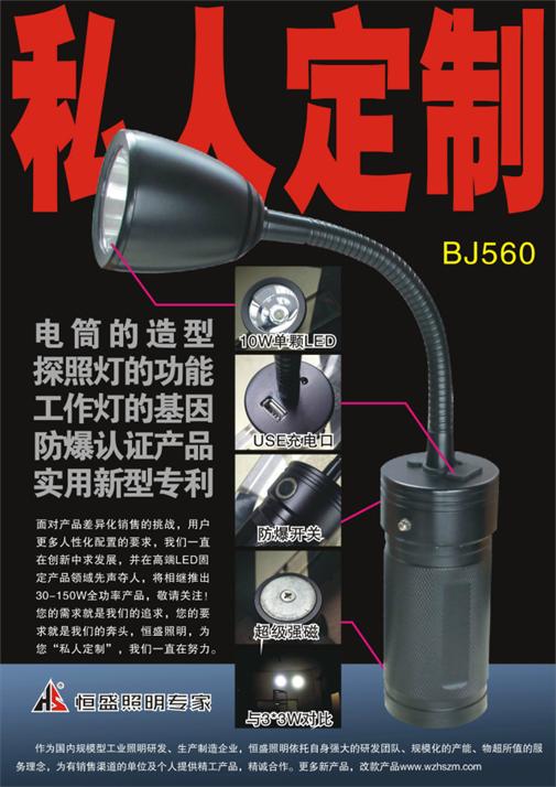 聯系人:劉經理BJ560型多功能防爆工作燈實用性強,10W國際頂級品牌LED亮度高,深照配光聚光型強,照射距離遠,強磁吸附式吸力強解放雙手作業,蛇桿燈頭結構可萬向任意調節照明射方向,數碼充電功能可為你隨時隨解決手機等電子產品應急充電功能,防爆結構設計并已通過國家級防爆認證,IP65的防護設計可在各種場合任意使用,經典!!