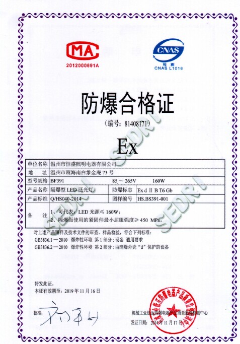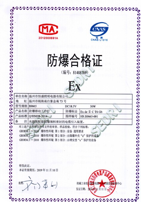 更多防爆合格證可以通過聯(lián)系恒盛照明公司查詢了解,公司始終以品質(zhì)為第一,努力打造防爆移動工作燈、佩戴式防爆強(qiáng)光照明燈、節(jié)能防爆強(qiáng)光電筒、防爆LED泛光燈等為主的防爆燈具生產(chǎn)基地。