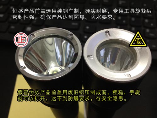 恒盛牌JW7623|JW7620佩戴式強(qiáng)光照明燈前蓋用純銅車制而成,使燈具在高空跌落也不會變形,可以正常使用,并需要有專用工具開蓋或合蓋,達(dá)到防爆要求。而假冒偽劣JW7620佩戴式強(qiáng)光照明燈| JW7623多功能強(qiáng)光巡檢工作燈僅采用一個(gè)鋁壓制的前蓋,手旋都可以打開,安全性能堪憂。