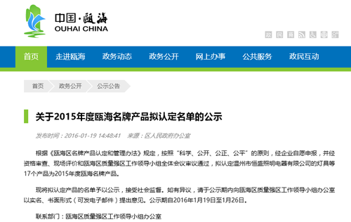 甌海區人民政府網站最近發布公告稱:根據《甌海區名牌產品認定和管理辦法》規定,按照“科學、公開、公正、公平”的原則,經企業自愿申報,并經資格審查、現場評價和甌海區質量強區工作領導小組全體會議審議通過,擬認定溫州市恒盛照明電器有限公司的燈具等17個產品為2015年度甌海名牌產品。此次同步進入的同行還有浙江正輝照明工程有限公司及浙江森馬企業等知名企業。