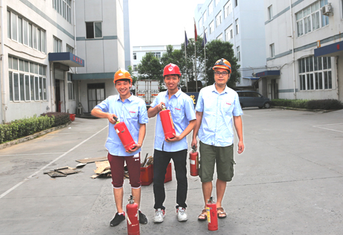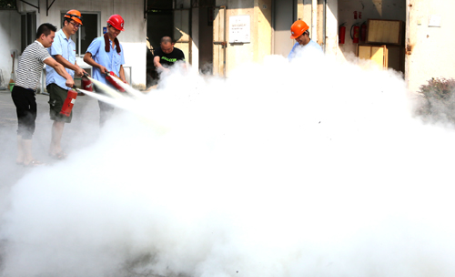 消防器材使用演練在公司大院舉行,洶洶的火焰燃起,勇敢的消防隊員沖進火場,拔出滅火器的保險,抽出插銷,壓下噴火嘴,干粉瞬間涌出,火苗就這樣悄無生息的滅了。