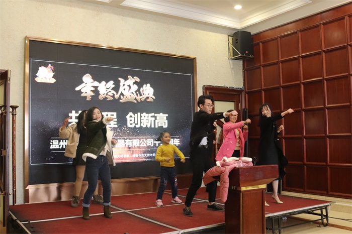 大會結束后,6點整喜迎分歲宴,歡喜迎新年!由市場部及采購部員工擔綱主持。晚宴開始前,由表演者:詹貽旺 黃四嬌 姚小敏 饒秋華 覃思慧 滿益倩帶來開場舞蹈“抓錢兔子舞”,為晚宴拉開了序幕。彭斌總經(jīng)理、詹百根副總經(jīng)理、車、沖床車間劉茂軍、注塑車間劉慶為我們的表演者送上鴻運當頭獎。并為晚宴送上了第一杯祝酒。